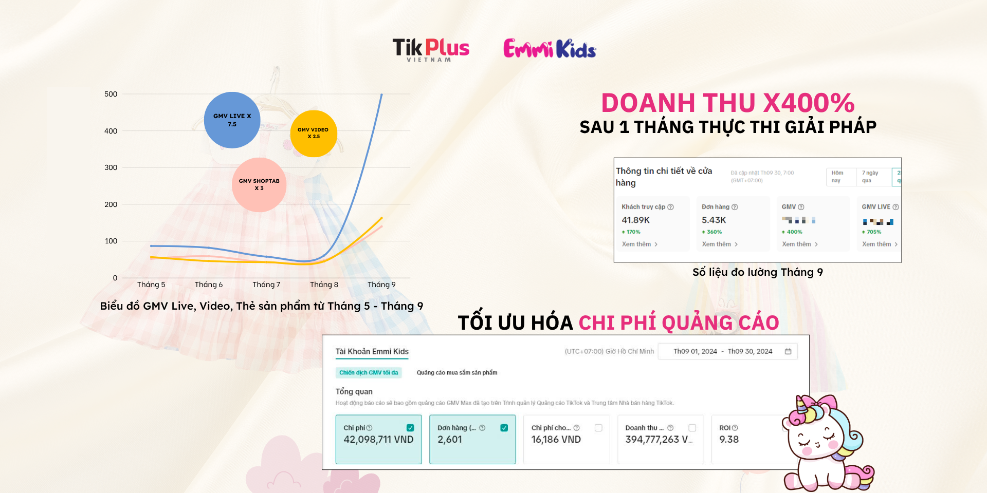 Emmi Kids là thương hiệu thời trang cho bé gái được yêu thích bởi phong cách đáng yêu, chất liệu an toàn và thiết kế tinh tế. Các sản phẩm của EMMI KIDS chủ yếu là Váy đầm cho bé gái, kèm phụ kiện như kẹp tóc, nơ, cài tóc,.. Sau khi triển khai Gói Dịch vụ Hỗ trợ Vận hành TikTok Shop của TikPlus Vietnam để xử lý toàn bộ khâu tối ưu gian hàng, sản phẩm. Tỷ trọng doanh thu từ livestream đạt 80% tổng GMV, trở thành nguồn thu chính. CTR video đạt 6.75%, CO đạt 3.92% – cao hơn trung bình ngành. Giảm CPC trung bình, tăng ROI x1.8 lần. Tiết kiệm hơn 30% chi phí quảng cáo mà vẫn giữ tốc độ tăng trưởng GMV.